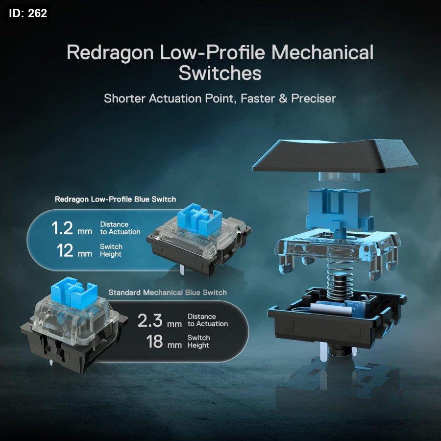 30% Cutted Ultra-Thin: Low profile designed throughout the whole keyboard from the bottom board, middle red mechanical switches and the top keycaps aim to shorten the distance to actuation as much as possible.