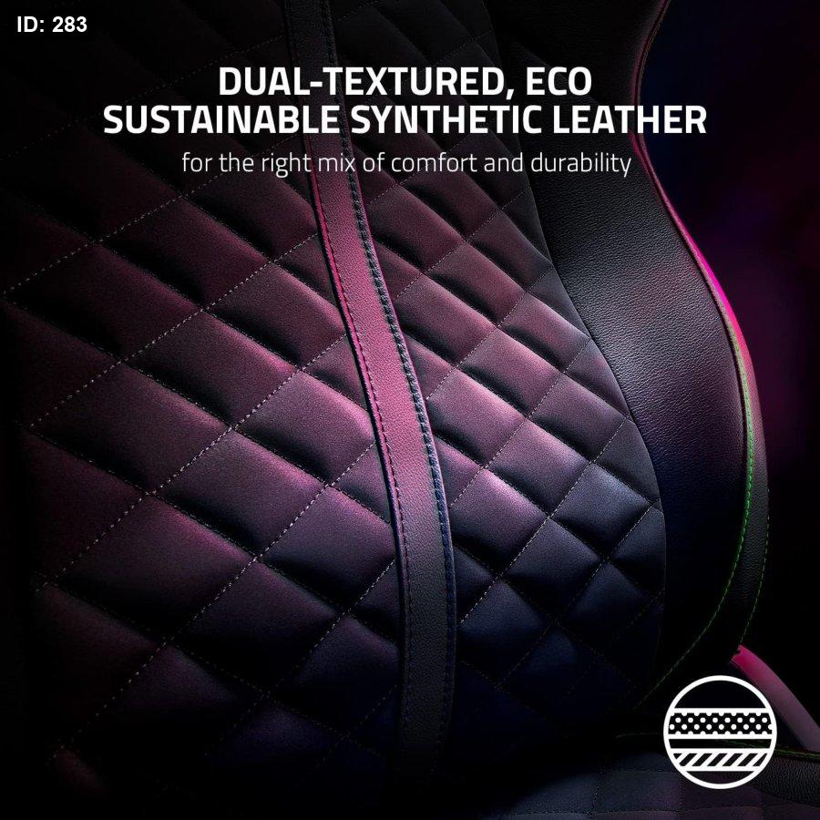 DUAL-TEXTURED, EC0-FRIENDLY SYNTHETIC LEATHER – Core areas of the chair are covered in a plush textured fabric for more refined comfort, while the outer edges are lined with smooth leather to better withstand daily wear and tear