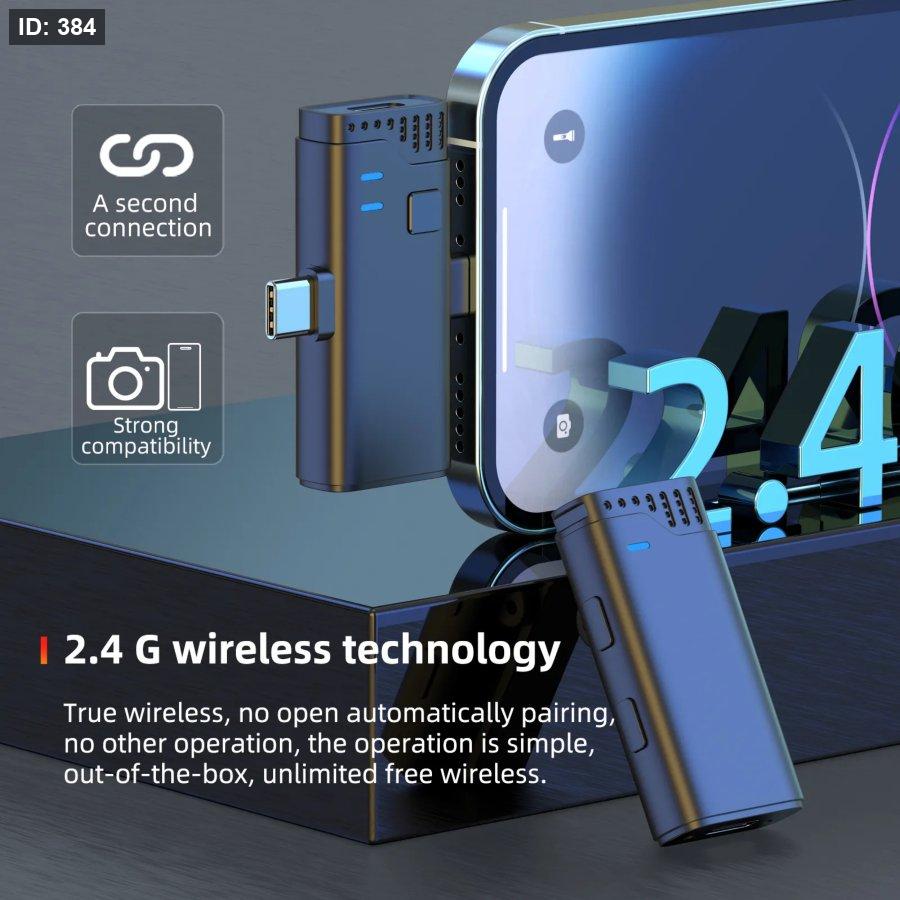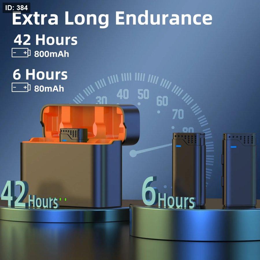 Dual-mic setup with one charging case—80 mAh per mic (≈6 hr runtime), 800 mAh case (≈42 hr)