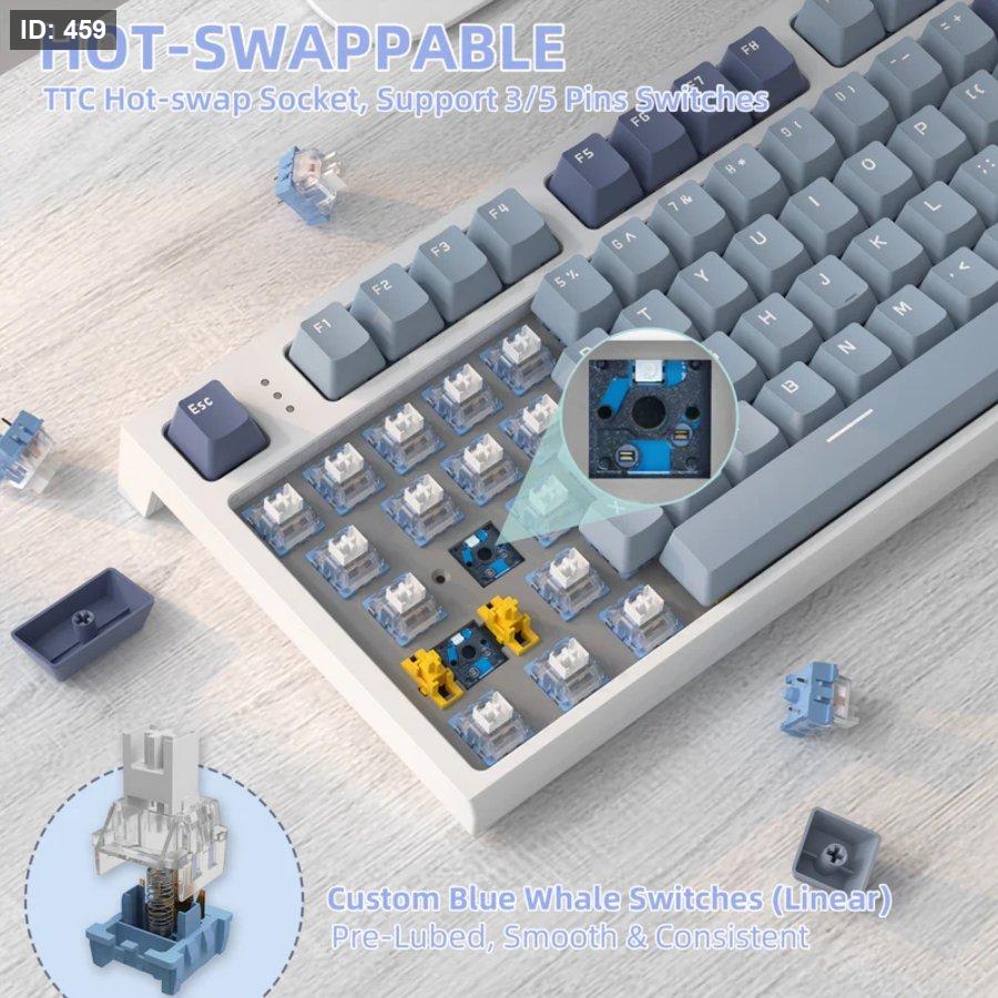 Switches: Hot‑swappable “Blue Whale” linear switches, compatible with 3/5‑pin (factory‑lubed)