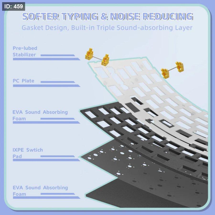 Mounting & Build: Gasket‑mounted design with EVA/foam layers and polycarbonate plate for cushioned typing feel