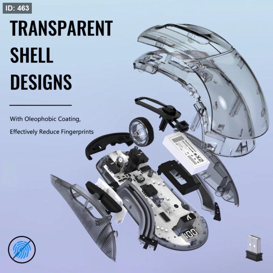 Transparent shell with 3D RGB lighting and oleophobic coating; silent switches reduce click noise by ~90%