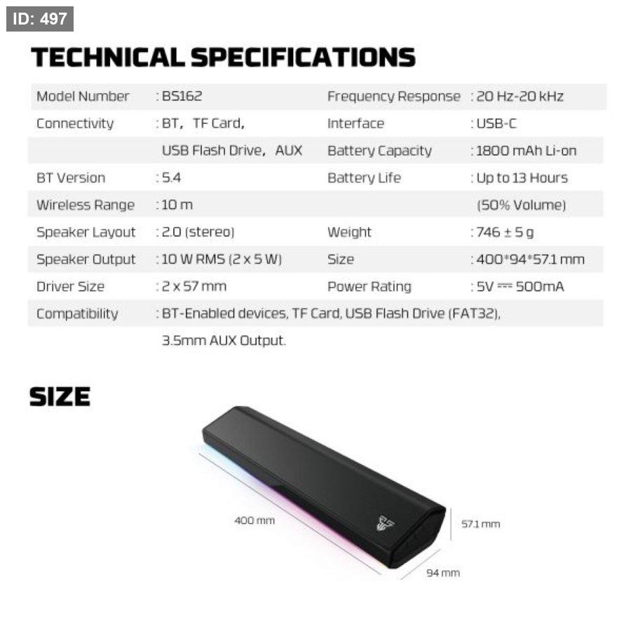 Compatibility: BT-Enabled devices, TF Card, USB Flash Drive (FAT32), 3.5mm AUX Output.